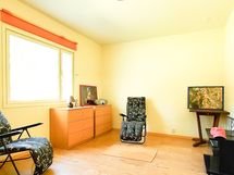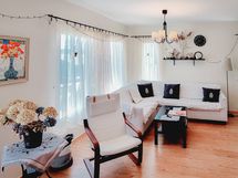 Oleskelutiloissa on laminaattilattiat ja maalatut seinät, keittiössä laattalattia.