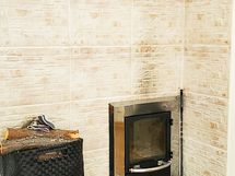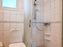 Varustus: suihkuseinä, lattialämmitys, wc-istuin, suihku, peili, kiinteät valaisimet, kylpyhuonekaapisto. Lattia: laatta. Seinät: kaakeli.