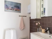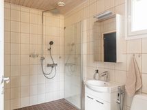 - Pesutilojen kuvaus: Tilavassa kylpyhuoneessa suihku, suihkuseinä, wc-istuin, pesuallas ja allaskaappi, peilikaappi, laattalattia, lattialämmitys, seinät kaakeloitu, ikkuna. Peilikaappi, pesuallas ja allaskaappi, suihku uusittu 2019. . Erillisen WC:n kuvaus: Erillisessä wc:ssä wc-istuin, pesuallas ja allaskaappi, valopeili, kaappi, bidee-suihku, laattalattia, seinät maalattu. Wc:n kalusteet uusittu 2021.