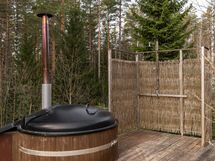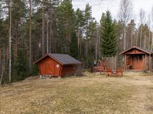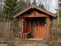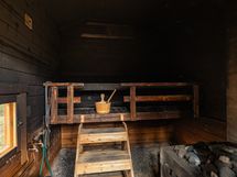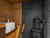 - Kuvaus: Puulämmitteinen Harvia kiuas (uusittu 2023), seinät ja katto paneloitu, lauteet, laattalattia. .