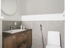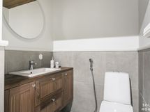 Kipsilevyillä lattiarakenne, jonka päällä kosteussulku ja laatoitus, lattialämmitys: sähköinen. Erillisten WC:n lukumäärä: 1. Erillisen WC:n kuvaus: Varustus: kaapistoa, tasoon upotettu allas, hana, seinäpeili valolla, wc-istuin, bide-suihku.