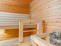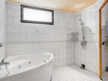 - Alakerran kylpyhuone: Kylpyhuoneesta on käynti talon saunaan, jossa on sähkökiuas. Kylpyhuoneessa on suihku ja poreallas.