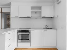 Yksiön keittiössä on uuni, keraaminen liesi ja keittiön kaapistot.