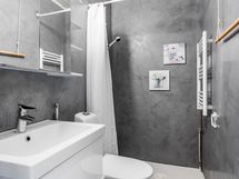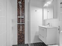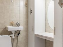 Yksiön kylpyhuoneessa on wc-istuin, suihku, suihkuseinä, käsienpesuallas, allaskaappi ja peilikaappi.