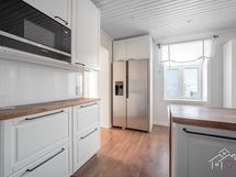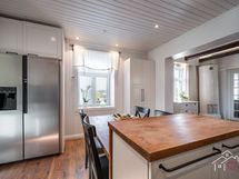 - Ikean keittiössä on saareke, kaapistot, Siemensin erillisuuni, Siemensin induktioliesi, rst jääkaappi/pakastin vesisäiliöllä ja jääpalakoneella (2023), integroitu Siemensin astianpesukone, SAVO:n rst liesituuletin, integroitu Siemensin mikro, karusellikaappi, puulämmitteinen kevyt takka, komposiittiallas Franke, tasot ja hana. Lattia on laminaattia ja seinät on maalattu, osittain rapattu. Välitila on lasia. Sisäkatto on alkuperäinen.