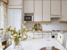 - Keittiö: laminaatti (alla mosaiikkiparketti ja solumuovi), kaapistojen kahvat