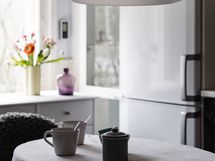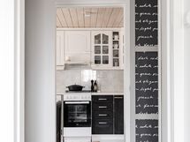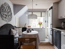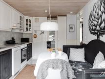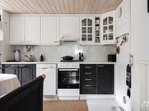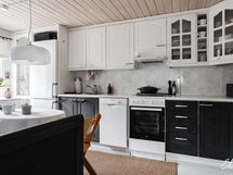- Keittiön varusteet: Jääkaappipakastin, astianpesukone ja liesituuletin (Aktiivihiilisuodatin). Liesi: Keraaminen liesi. Työtason materiaali: Laminaatti.