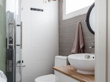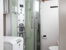 - Pesutilojen varusteet: WC-istuin, pesukoneliitäntä, peilikaappi, peili, pesuallas, allaskaappi, infrapunahöyrysuihku ja bidee-suihku.