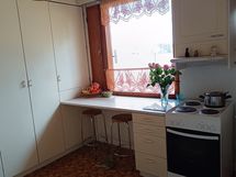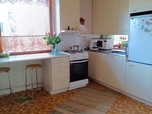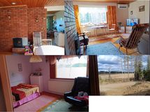 Sisäkatot paneloitu, lakatut puulattiat, keittiössä muovimatto.