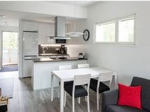 2 mh (vuoteet 2 + 2), iso tupakeittiö (olohuoneessa levitettävä sohva, makuupaikka kahdelle), 2xWC, sauna pesutiloineen, takka sekä ulkona varastotilat, lisäksi iso lasitettu parveke, jossa sähkögrilli talon puolesta. Myös polttopuut kuuluvat hintaan. Pesuhuoneessa pyykinpesukone sekä kuivauskaappi, keittiössä luonnollisesti tiskikone. Astiasto Iittalan Teemaa.