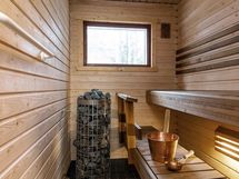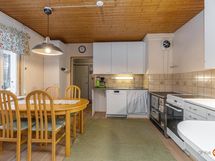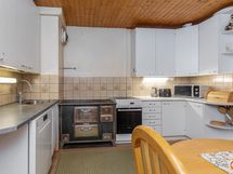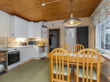 Keittiössä on tilaa kokkailla fiiliksen mukaan puu- tai sähköliedellä ja arkiateriat sujuvat mukavasti keittiön ruokapöydän äärellä.