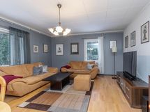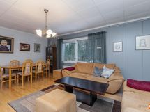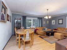 Hulppean kokoiseen ja valoisaan olohuoneeseen mahtuu ison sohvakaluston lisäksi isompikin ruokapöytä.