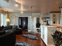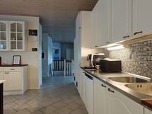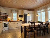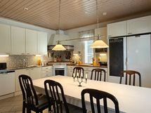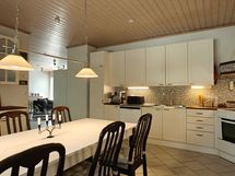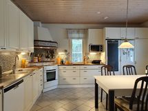 - Tilaa isolle ruokapöydälle, Paljon kaappitilaa, Paljon työskentelytilaa, Suuri tiskipöytä, Lasikaapit, Puutasot, Astianpesukone, Pesukoneliitos, Sähköliesi, Keraaminen liesi, Liesituuletin, Liesikupu, Jääkaappi, Pakastin