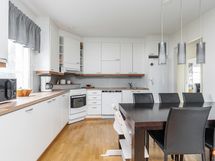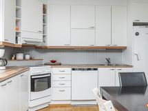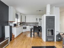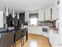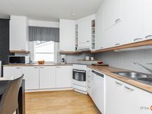 - Jääkaappi, pakastekaappi, keraaminen liesi, liesituuletin talotuuletin, astianpesukone, kaapistot. Tilava keittiö, jossa kaapistoja kahdella sivulla. Mukavasti lasku- ja kaappitilaa. Keittiö kokonaisuudessaan auki olohuoneeseen. Avara ja valoisa keittiö olohuone tilaratkaisu.
