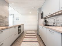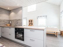 - Keittiön varusteet: Jääkaappi, mikroaaltouuni, astianpesukone (integroitu), uuni, liesi (liesitaso) ja liesituuletin (lieden levyjen välissä). Liesi: Induktioliesi. Työtason materiaali: Laminaatti. Keittiössä on Noblessan kalusteet. Keittiössä on runsaasti säilytys- ja laskutilaa. Kaapistojen välitila on laatoitettu. Palomuuri on käsitelty läpivärjätyllä laastilla.