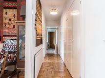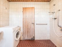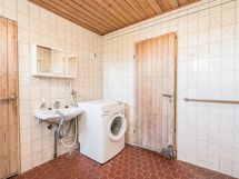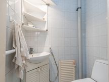 - Pesutilojen varusteet: Suihku, pesukoneliitäntä, lattialämmitys, peilikaappi ja pesuallas. Pesutilojen kuvaus: Pesutiloja on kunnostettu 1980-luvun alussa. Laattalattia on alkuperäinen. Erillisten WC:n lukumäärä: 1. Erillisen WC:n varusteet: WC-istuin, pesuallas, allaskaappi ja bidee-suihku.