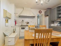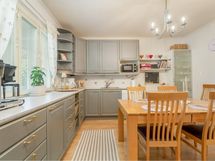 Liesi: sähköliesi, puuliesi. Työtasot: laminaatti. Kylmäsäilytys: jääkaappi. Varustus: liesikupu, astianpesukone, kiinteät valaisimet.