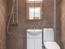 - Kylpyhuone, suihku, peilikaappi, allaskaappi, pesukoneliitäntä, kiinteät valaisimet, pide-suihku allaskaapissa. Kauttaaltaan 2025 remontoitu upea ja käyttämätön kylpyhuone, jossa ajan vaatimukset täyttävä vesieriste. Hyvällä maulla valitut laatoitukset ja kiintokalusteet. Hieno toiminnallinen kokonaisuus. Hyvä paikka pesukoneelle. Kylpyhuoneeseen asennettu määräykset täyttävä vikavirta pistorasia