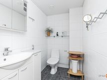 - Sauna, sähkökiuas, suihku, peilikaappi, allaskaappi, pesukoneliitäntä, lattialämmitys kylpyhuoneen osalta, kiinteät valaisimet.