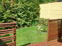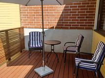 Iso asunnon mittainen parveke ja kaunis takapiha. Tilava eteinen, kivat yksityiskohdat.