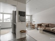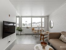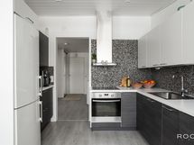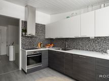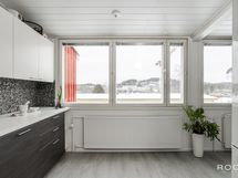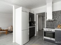 - Keittiön varusteet: Jääkaappipakastin, liesituuletin, astianpesukone ja liesi. Liesi: Keraaminen liesi. Työtason materiaali: Laminaatti.