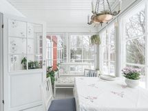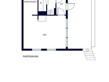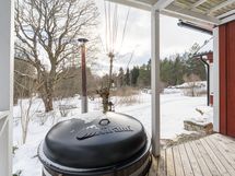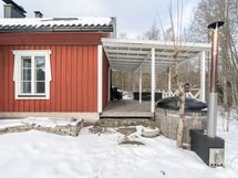 - Saunaosatolta on kulku katetulle terassille talon taakse. Lasiverannan sisäänkäynnin edessä on myös terassi ulkokalusteille.