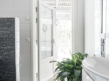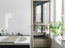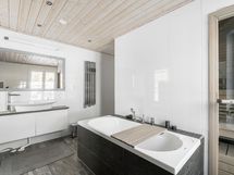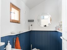 - Pesutilojen varusteet: WC-istuin, suihku, kylpyamme, lattialämmitys, pesuallas, allaskaappi, peili ja bidee-suihku. Pesutilojen kuvaus: Vuonna 2011 valmistunut saunaosasto, joka sisältää kylpemiseen Projecta Jacuzzin laatoitukseen integroidun ammeen ja myös tavallisen suihkun. Erillinen wc tila ja pyyhekaapistot tuovat oikeaa kylpylän tuntua. Saunaosastolta on käynti myös katetulle terassille, jossa sijaitsee puulämmitteinen Kiramin kylpytynnyri. Erillinen pyyhekuivain kuivattaa pyyhkeet nopeasti ja sähköinen tuuletuspuhallin pitää ilman raikkaana. Erillisten WC:n lukumäärä: 1. Erillisen WC:n varusteet: WC-istuin, pesuallas ja lattiakaivo. Erillisen WC:n kuvaus: Erillinen wc on ns. pikkuvessa. Alunperin kerrosten välissä olevassa wc-tilassa on ollut bioistuin, mutta nyt projekti on vielä hieman kesken, koska vaihtoehtona on palauttaa biokäymälä tai asentaa pienempään asiointiin vesikäyttöinen istuin. Lattia on mosaiikkilaattaa ja seinäpaneelin taakse saakka vesieritetty jo valmiiksi.