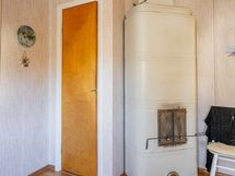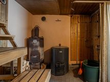 Kiuas: Puukiuas. Saunassa puukiuas ja lämminvesisäiliö.