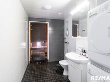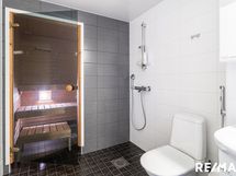Pesutilojen varusteet: WC-istuin, suihku, pesukoneliitäntä ja lattialämmitys.