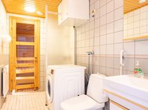 - Sauna, sähkökiuas, kylpyhuone, suihku, suihkuseinä, peilikaappi, allaskaappi, pesukoneliitäntä, kiinteät valaisimet.