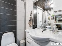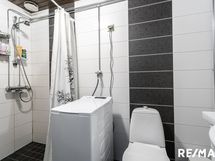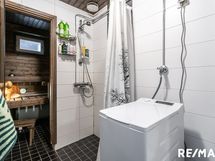 - Pesutilojen varusteet: WC-istuin, suihku, pesukoneliitäntä, lattialämmitys, allaskaappi, pesuallas ja peili. Pesutilojen kuvaus: Remontoitu 2015.