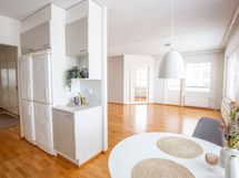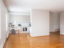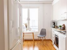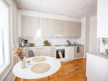 - Keittiön varusteet: Liesi, astianpesukone, liesituuletin ja jääkaappipakastin x 2. Liesi: Sähköhella. Työtason materiaali: Laminaatti. Keittiössä tehty kaunis ja harmoninen pintaremontointi 01/2026, uusittu kaapinovet, työtaso, uudet led-valaisimet, kattovalaisin ja välitilalevy.