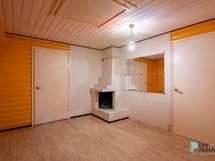Sauna: puupaneeli, muovimatto. Kylpyhuone: laatta, muovimatto. Huonetilat: seinät: tapetti, lattia: muovimatto tai laminaatti, olohuoneessa parketti.