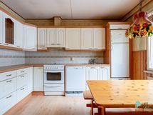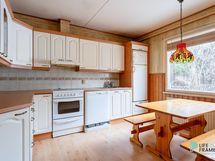 Jääkaappipakastin, keraaminen liesi, liesikupu, astianpesukone, kaapistot, kiinteät valaisimet.