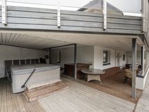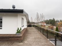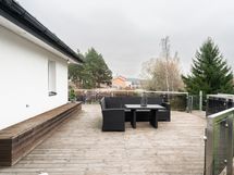 Iso katettu terassitila jossa ulkoporeamme sekä tämän yläpuolella iso avoin terassi.