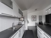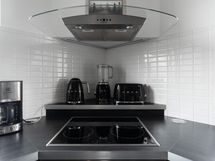 Keittiön varusteet: Jääkaappi, erillinen pakastin ja astianpesukone (nostettu ylös). Liesi: Induktioliesi.