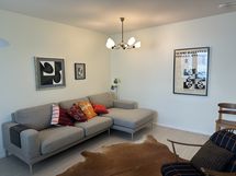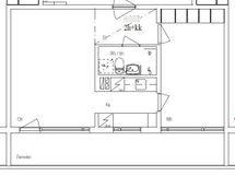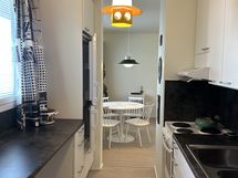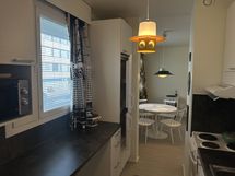 Varusteet: Jääkaappipakastin, Astianpesukone. Työtaso: Laminaattitaso. Liesi: Sähköliesi, Liesituuletin. Keittiössä on ikkuna, josta tulee kauniisti valoa tilaan.