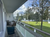 Lasitettu parveke. Iso, koko huoneiston levyinen parveke, josta näkymä myös järvelle.