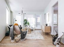 Tilava päätykaksio lasitetulla parvekkeella. Kodissa kaunis suurehko sauna ikkunalla. Paljon ikkunoita lännen suuntaan. Tilaa säästävät liukuovet makuuhuoneessa. Erikoinen vinoseinä, joka tuo persoonallisuutta asuntoon.