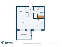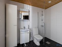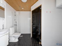 Varustus: suihkuseinä, pesukoneliitäntä, lattialämmitys, wc-istuin, suihku, peilikaappi.