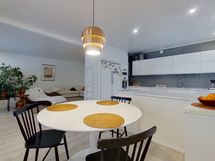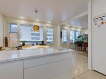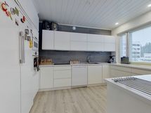 - Liesi: keraaminen, erillisuuni. Työtasot: laminaatti. Kylmäsäilytys: jääkaappi, pakastin. Varustus: liesituuletin, mikroaaltouuni, astianpesukone. Iso keittiö, jossa runsaasti lasku- ja säilytystilaa. Ruokaryhmälle tilaa saarekkeen toisella puolella. Ruokailutilasta kulku parvekkeelle.