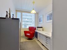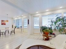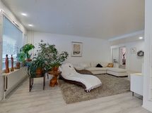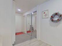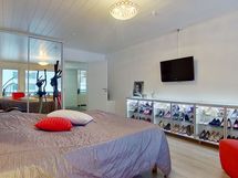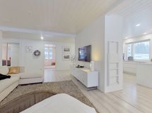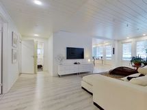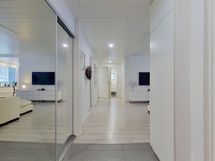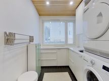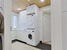 - Muuta kauppaan kuuluvaa: Kylpyhuoneen seinän lasiset kosmetiikkahyllyt ja kodinhoitohuoneen seinän kiinteä vedettävä kuivausteline. Kauppaan ei kuulu: Keittiön seinällä roikkuvat valkoiset aputikkaat.
