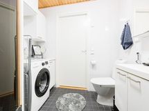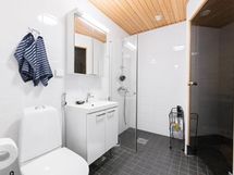 Sauna, sähkökiuas, suihku, suihkuseinä, peilikaappi, allaskaappi, pesukoneliitäntä, lattialämmitys, kiinteät valaisimet.