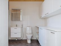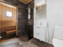 Sauna, kylpyhuone, suihku, peilikaappi, allaskaappi, pesukoneliitäntä, lattialämmitys, kiinteät valaisimet.