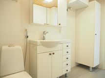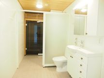 Sauna, kylpyhuone, suihku, peilikaappi, pesukoneliitäntä.