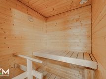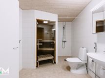 - Kylpyhuoneessa wc-istuin, käsienpesuallas, peilikaappi, kylpyhuonekaapisto, pesukoneliitäntä, suihku. Sähkösauna.