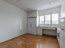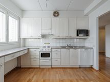 Jääkaappi, pakastekaappi, sähköliesi, kaapistot, kiinteät valaisimet.