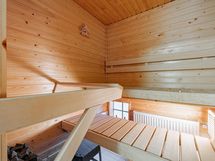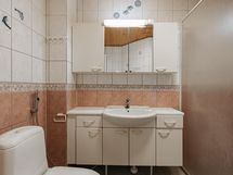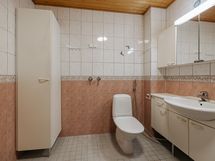 Sauna, sähkökiuas, suihku, peilikaappi, allaskaappi, pesukoneliitäntä, lattialämmitys.