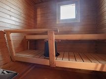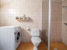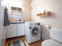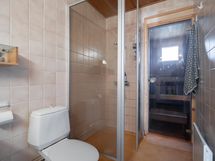 Sauna, sähkökiuas, kylpyhuone, suihku, suihkuseinä, peilit, peilikaappi, kaapit, pesukoneliitäntä, kiinteät valaisimet.
