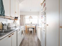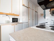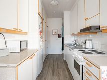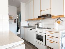 Jääkaappipakastin, sähköliesi, liesituuletin, astianpesukone, kaapistot, kiinteät valaisimet.